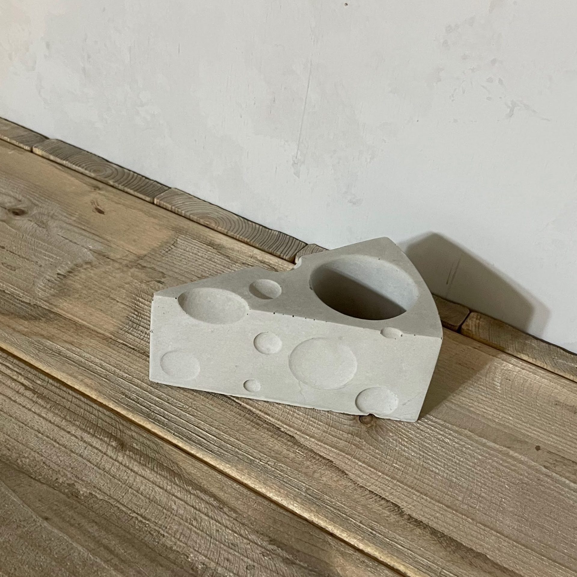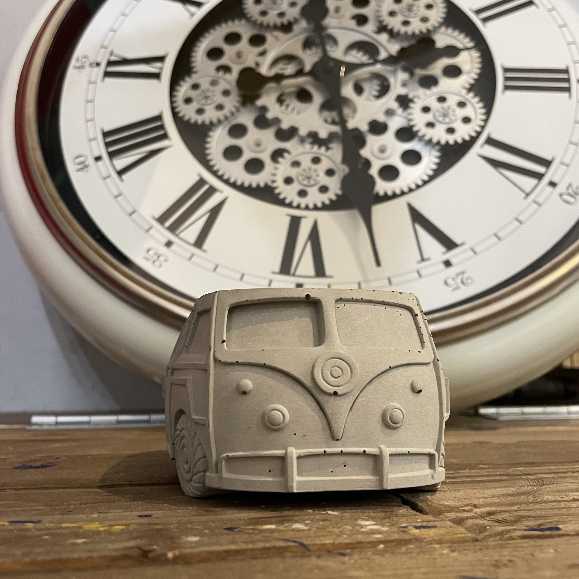 まず、CLUMSY/クランジーのオリジナル作品を手にして頂いたときの”物語”を考え、そこに実用性を兼ね備えること思案します。サイズ感を考慮しながら、元になる原形を作ります。その原形を”シリコン”で型取りを行ないます。型取りした”シリコン”に”セメント”を流し込むのですが、気泡を防ぐのに機械で振動を与えながら作業します。これは細部まで密に仕上げるために最も重要です。1番大事なことは、【温度】【湿度】【水温】を一定に保たないといけません。なぜなら、冬季や梅雨などの湿度の高い時期や、真夏の日当たりの良い南向きなどの場合に、”セメント”の表面に白い粉状の物質(炭酸カルシウム)が浮き出る白樺現が起こるからです。